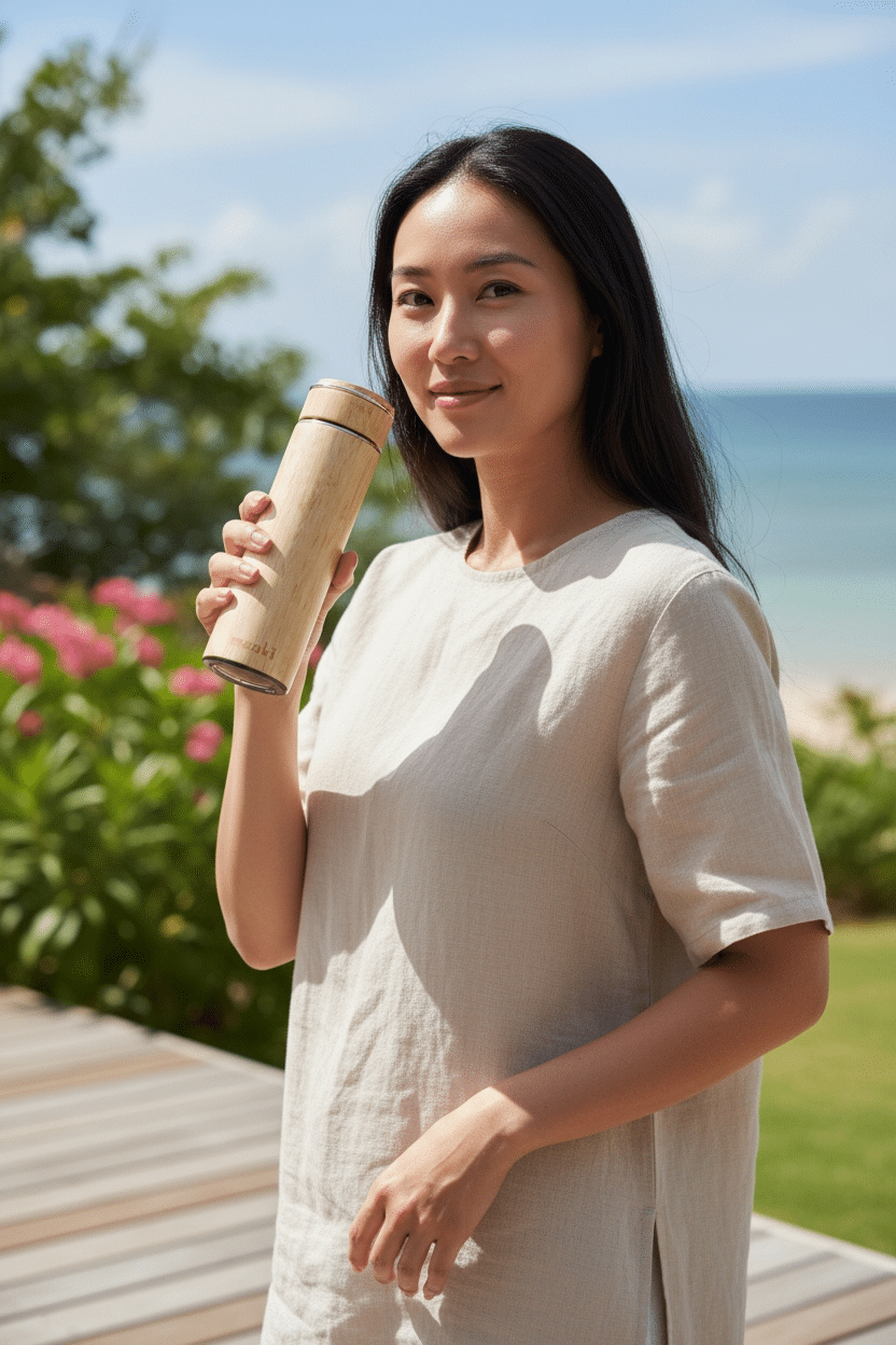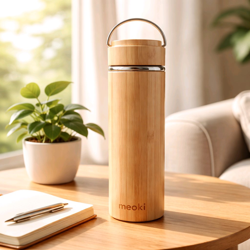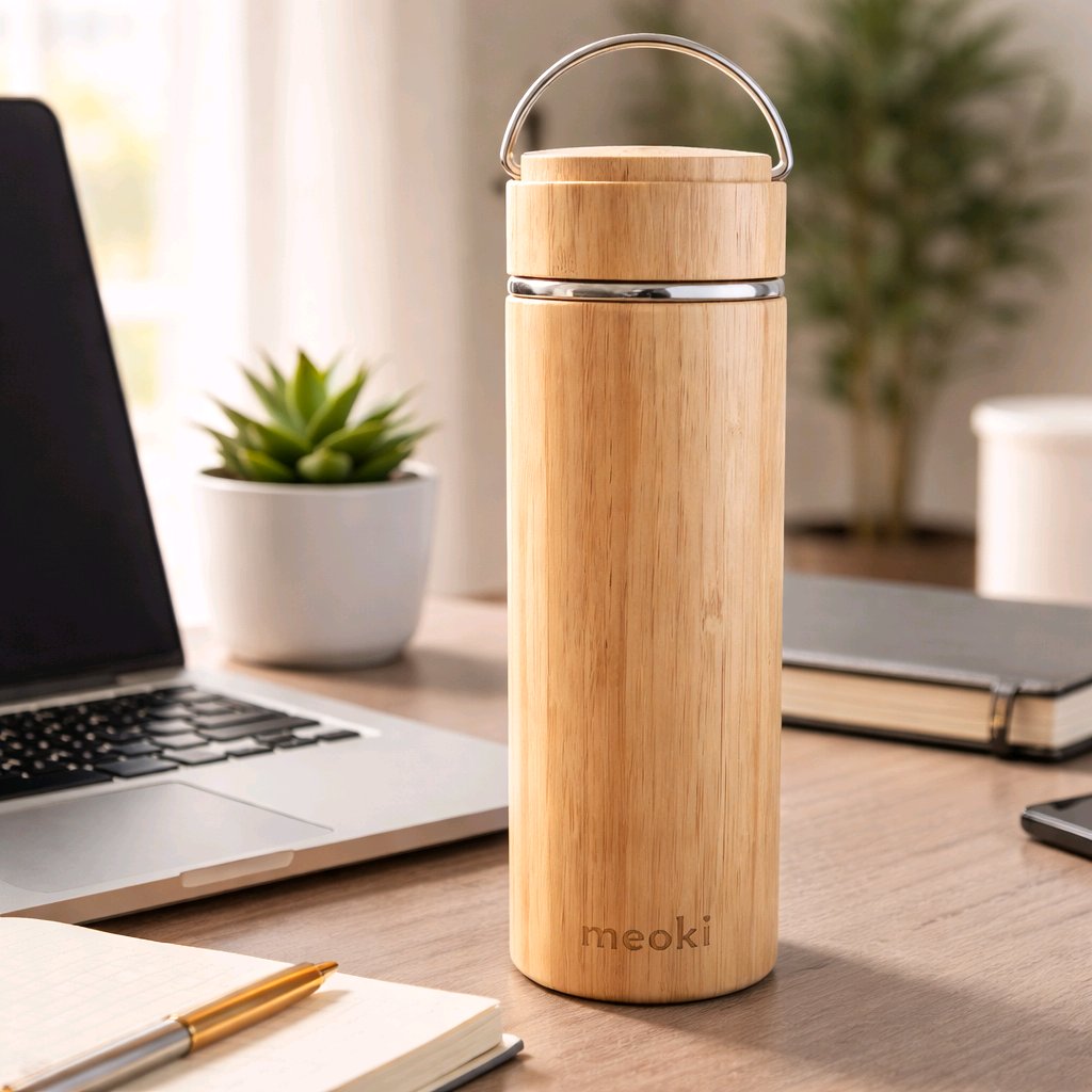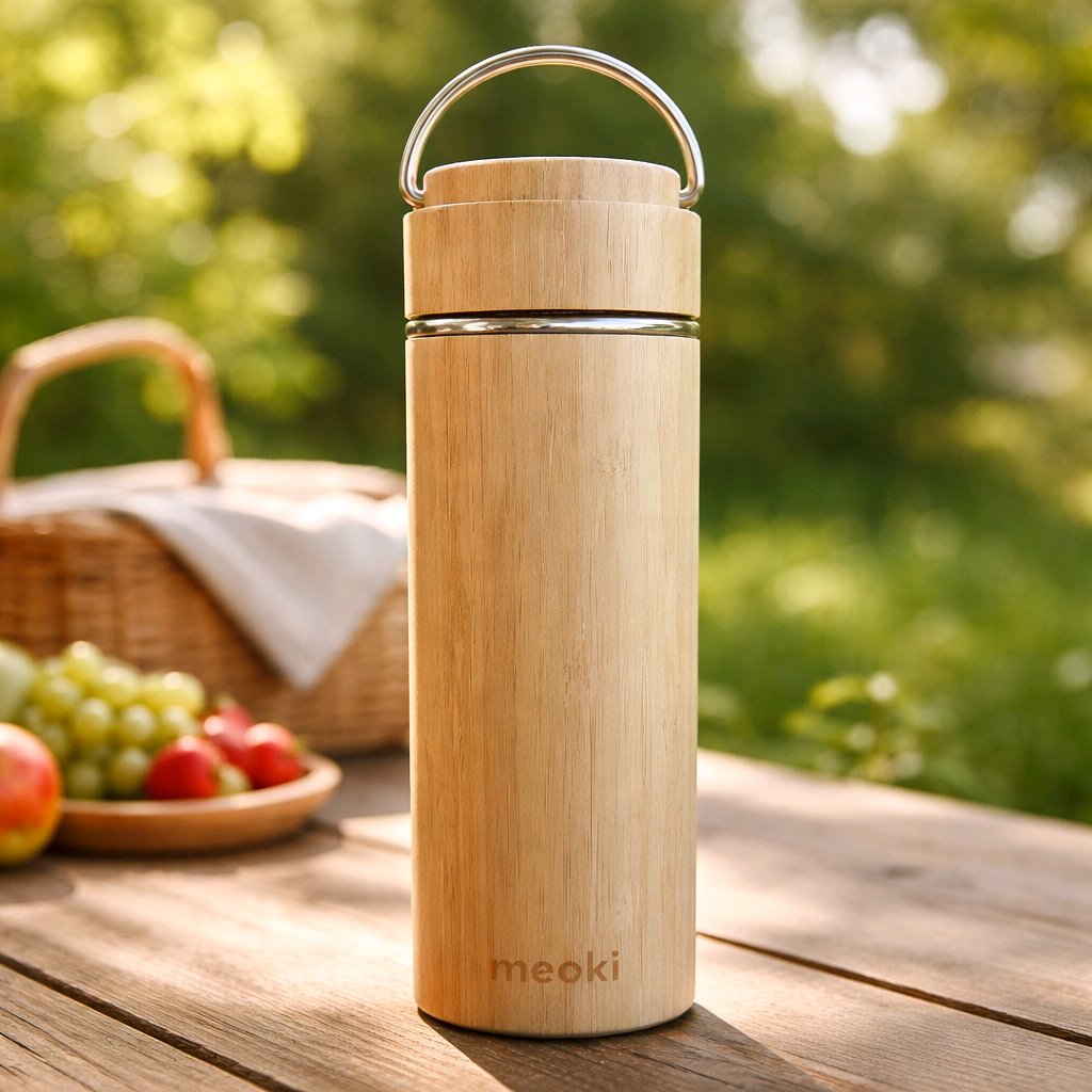 A stylish bamboo thermos bottle with a stainless steel interior, designed to keep drinks hot or cold for up to 6 hours. Reusable, food-safe, and perfect for everyday use, travel, and outdoor adventures.