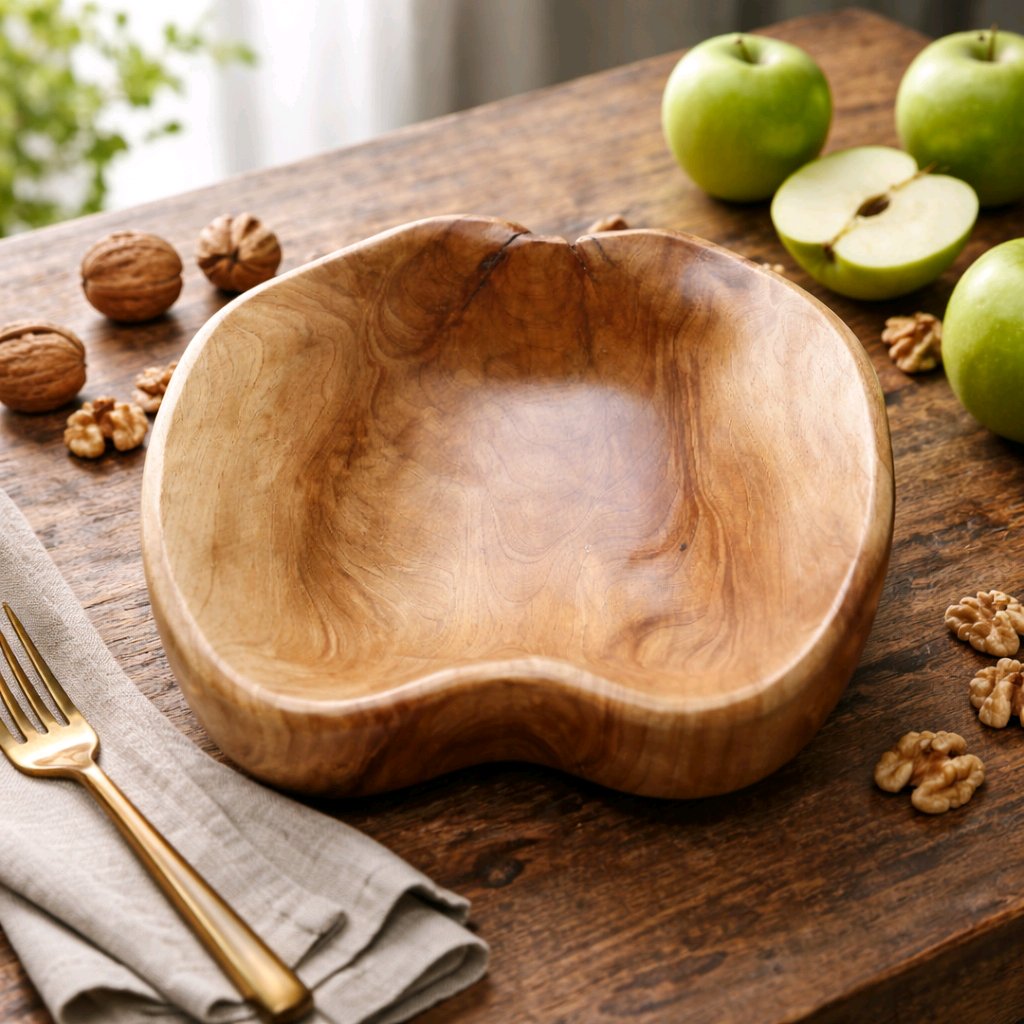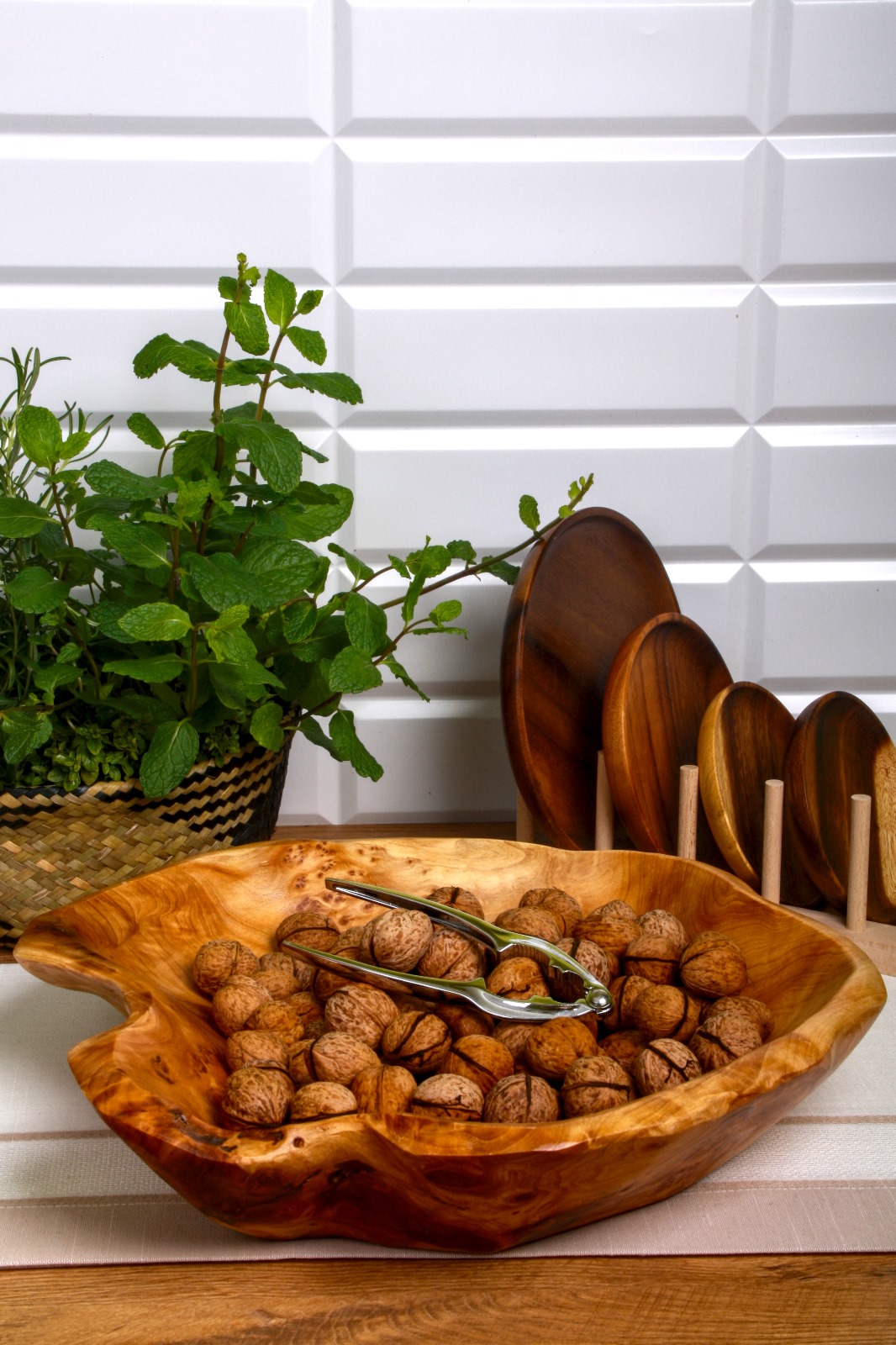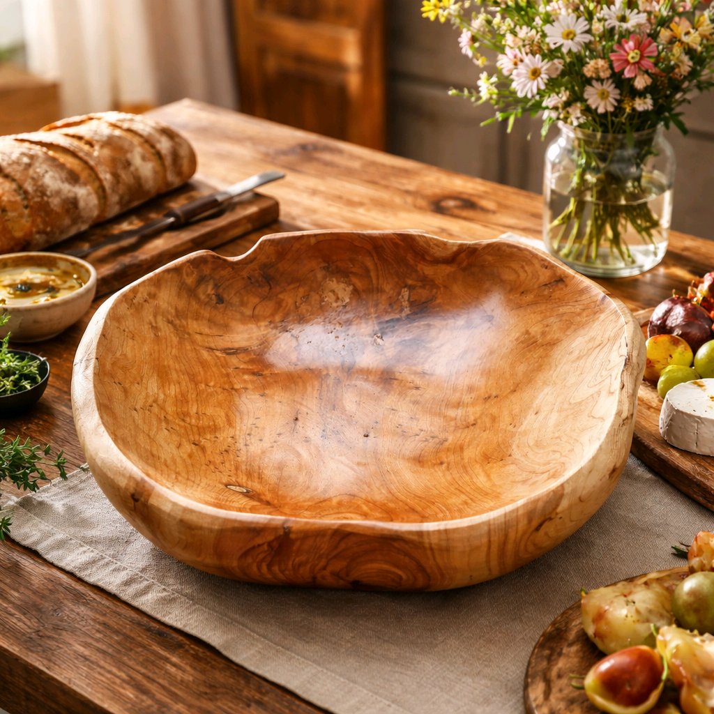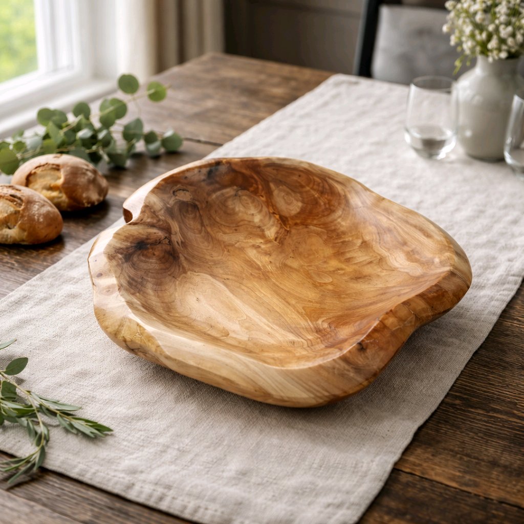 Moreover, this wooden bowl and plate set balances function and aesthetics beautifully. It works perfectly for serving fruits, bread, or salads, while also acting as a decorative display. As a result, its sculptural, antique-inspired shape adds character to dining tables, kitchen counters, and living spaces.