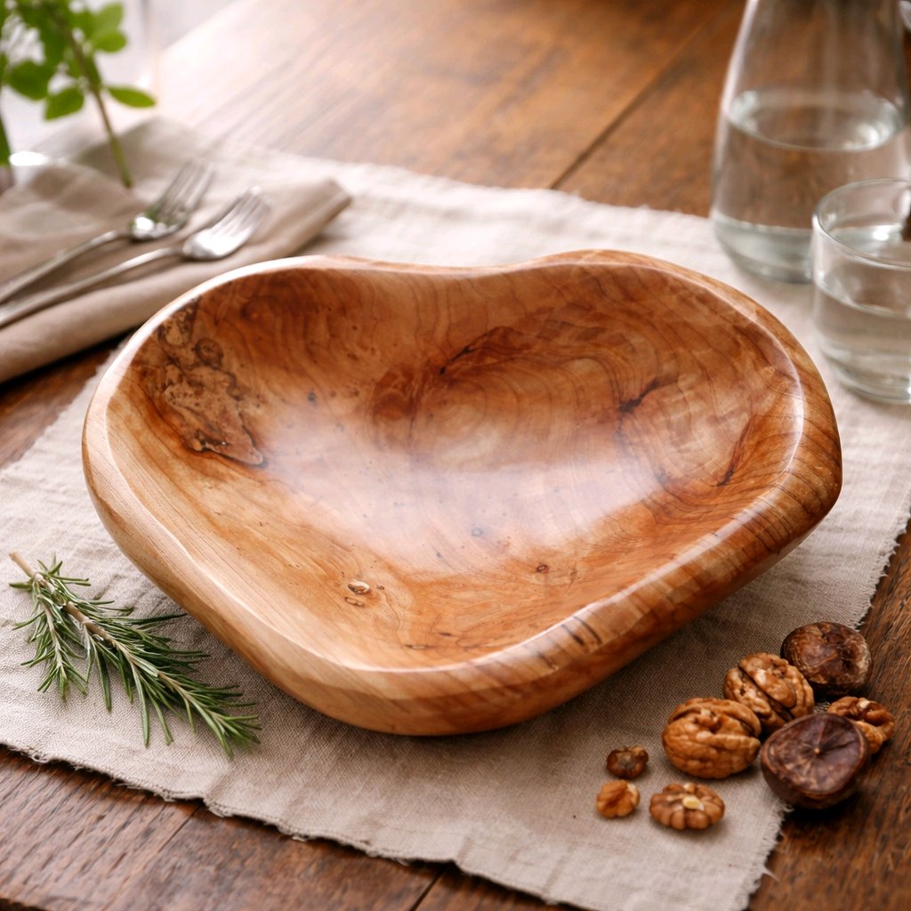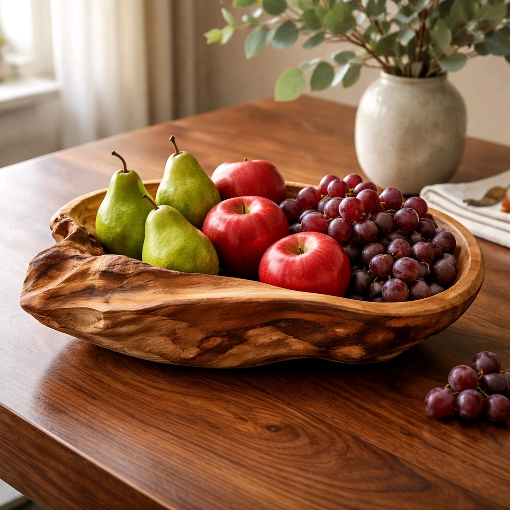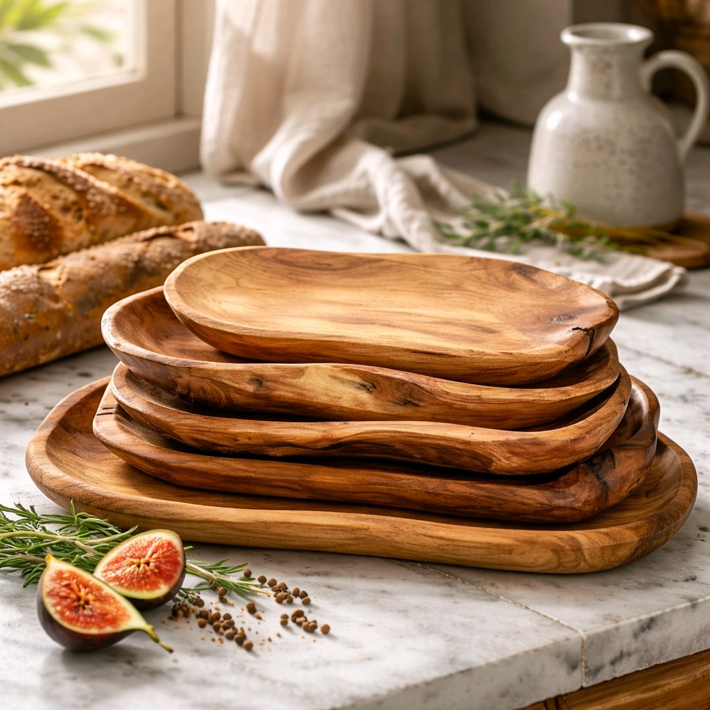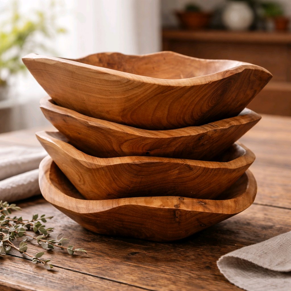 Moreover, this wooden bowl and plate set balances function and aesthetics beautifully. It works perfectly for serving fruits, bread, or salads, while also acting as a decorative display. As a result, its sculptural, antique-inspired shape adds character to dining tables, kitchen counters, and living spaces.