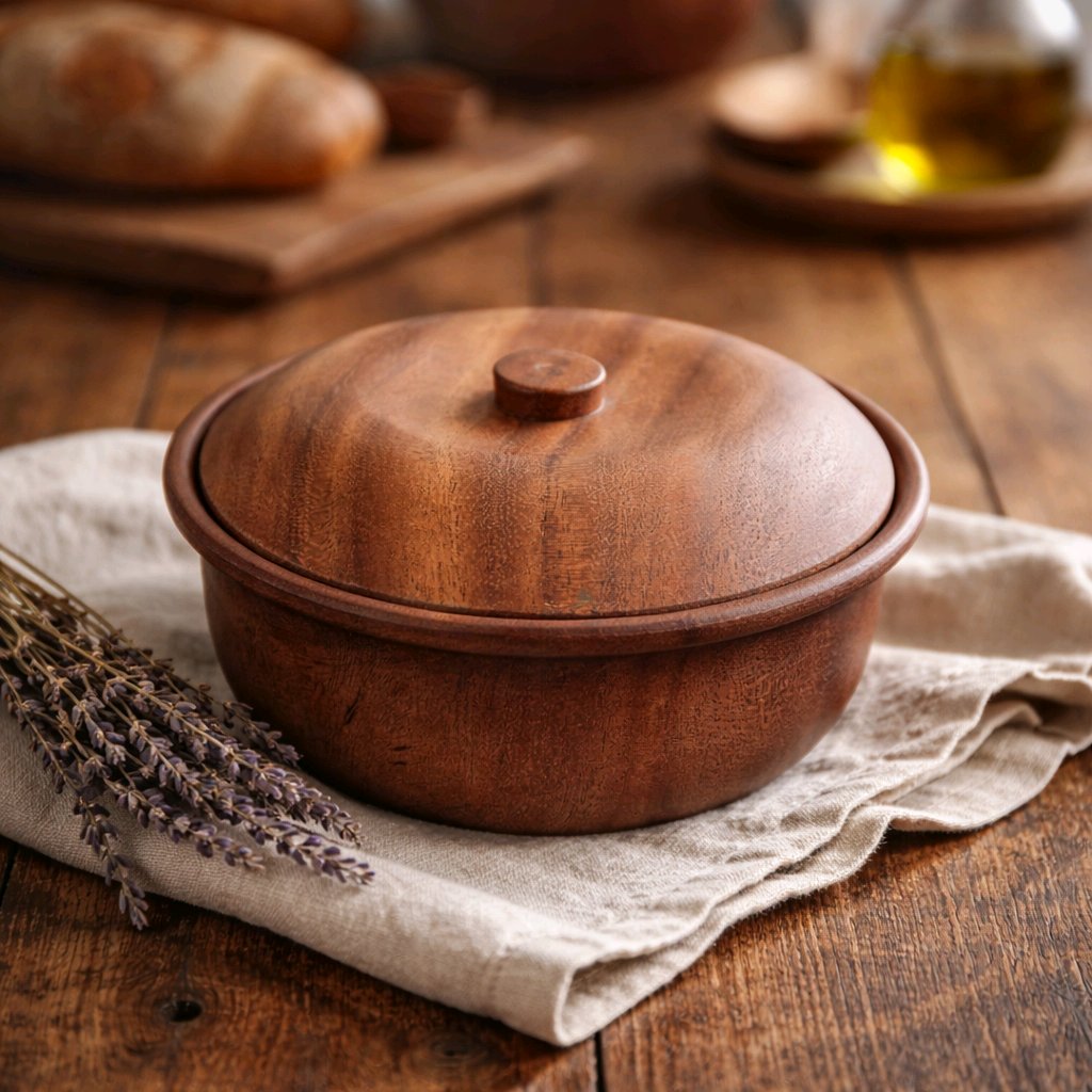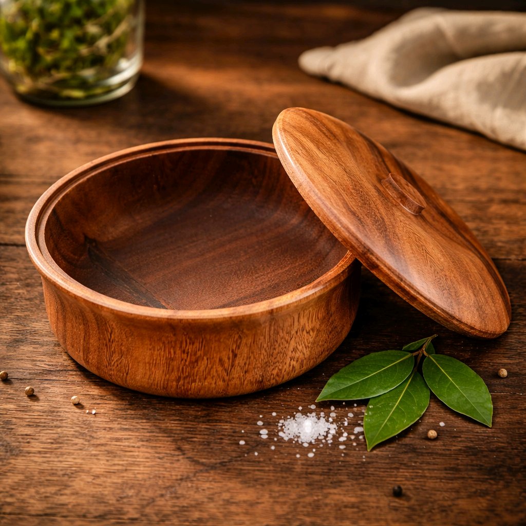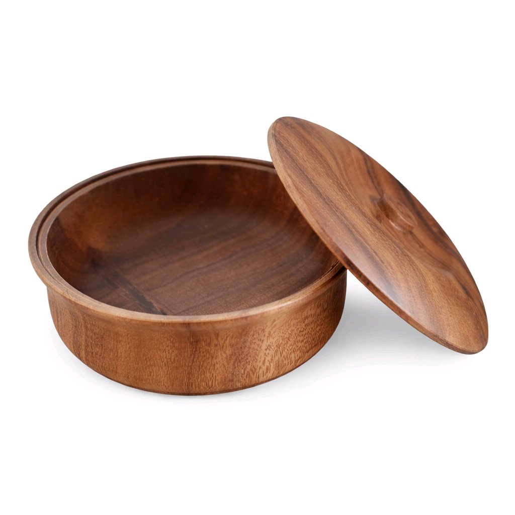 A handcrafted acacia wood bowl with lid, perfect for serving soups, stews, rice dishes, or stylish food storage. Made from solid natural wood, durable, eco-friendly, and beautifully finished.