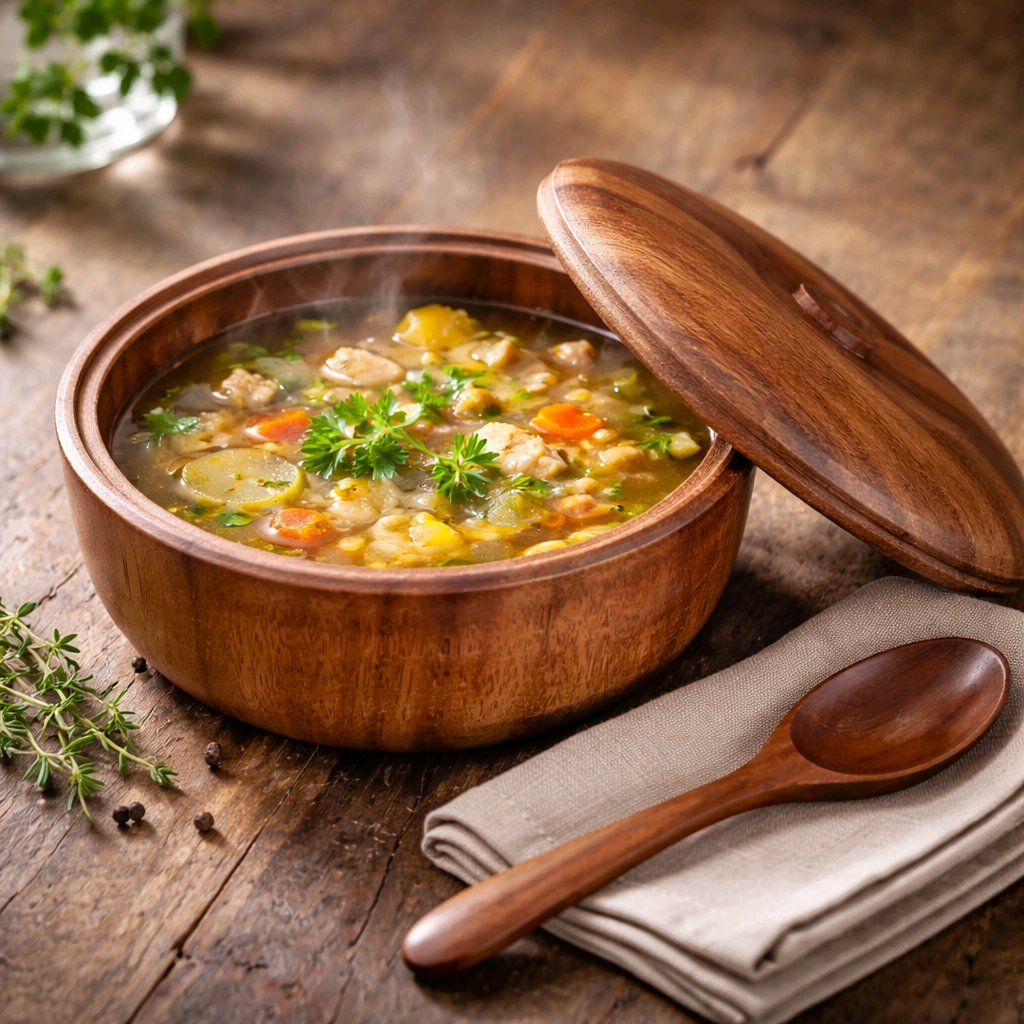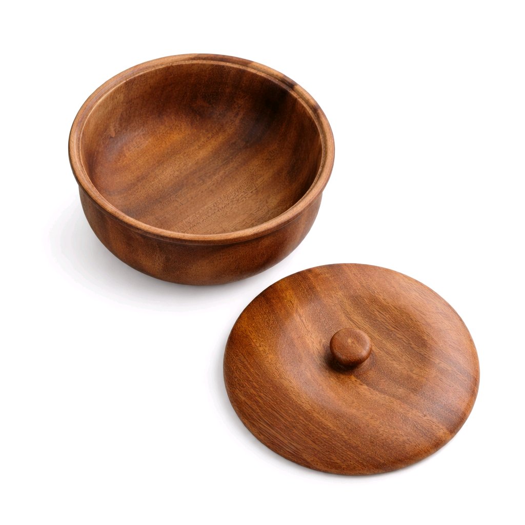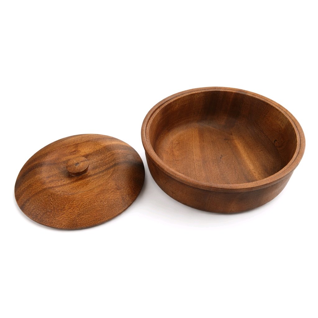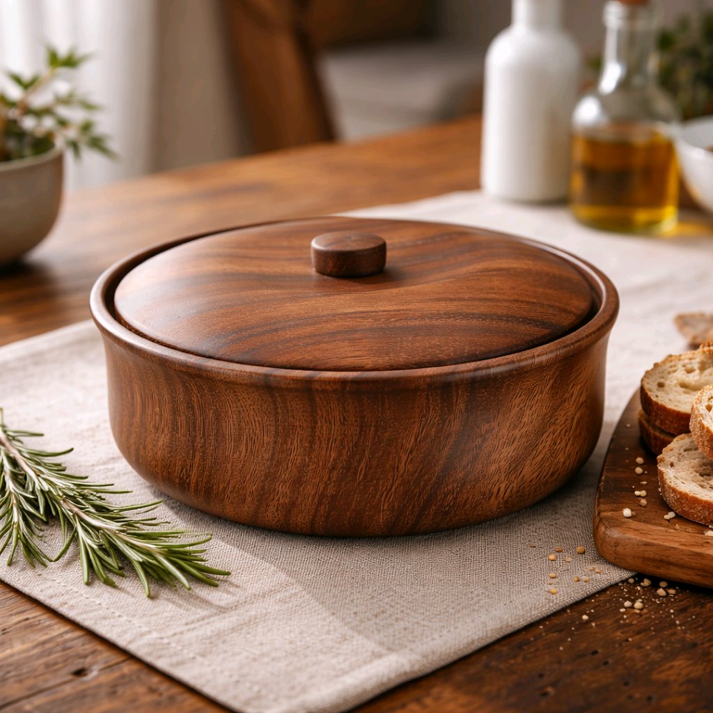 A handcrafted acacia wood bowl with lid, perfect for serving soups, stews, rice dishes, or stylish food storage. Made from solid natural wood, durable, eco-friendly, and beautifully finished.