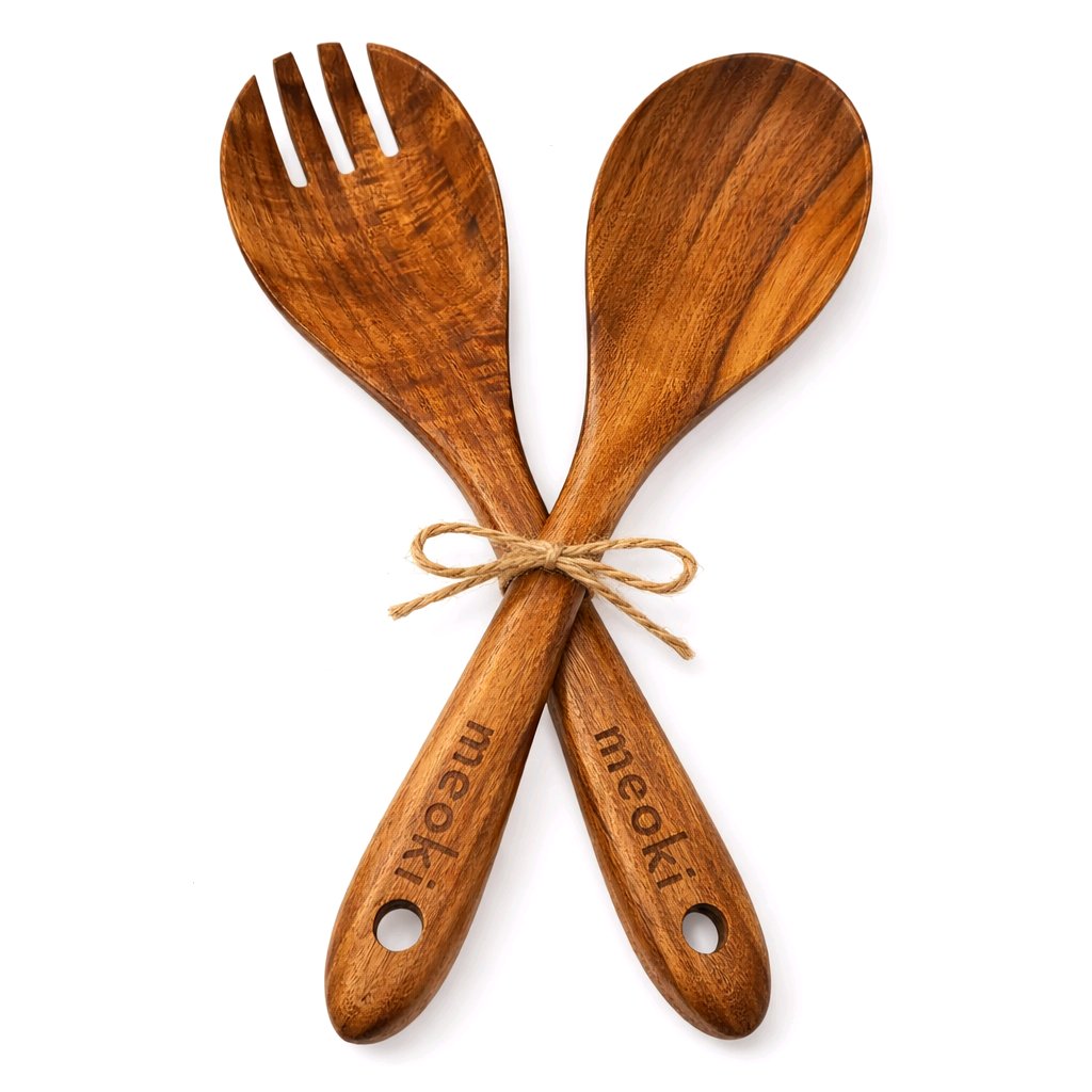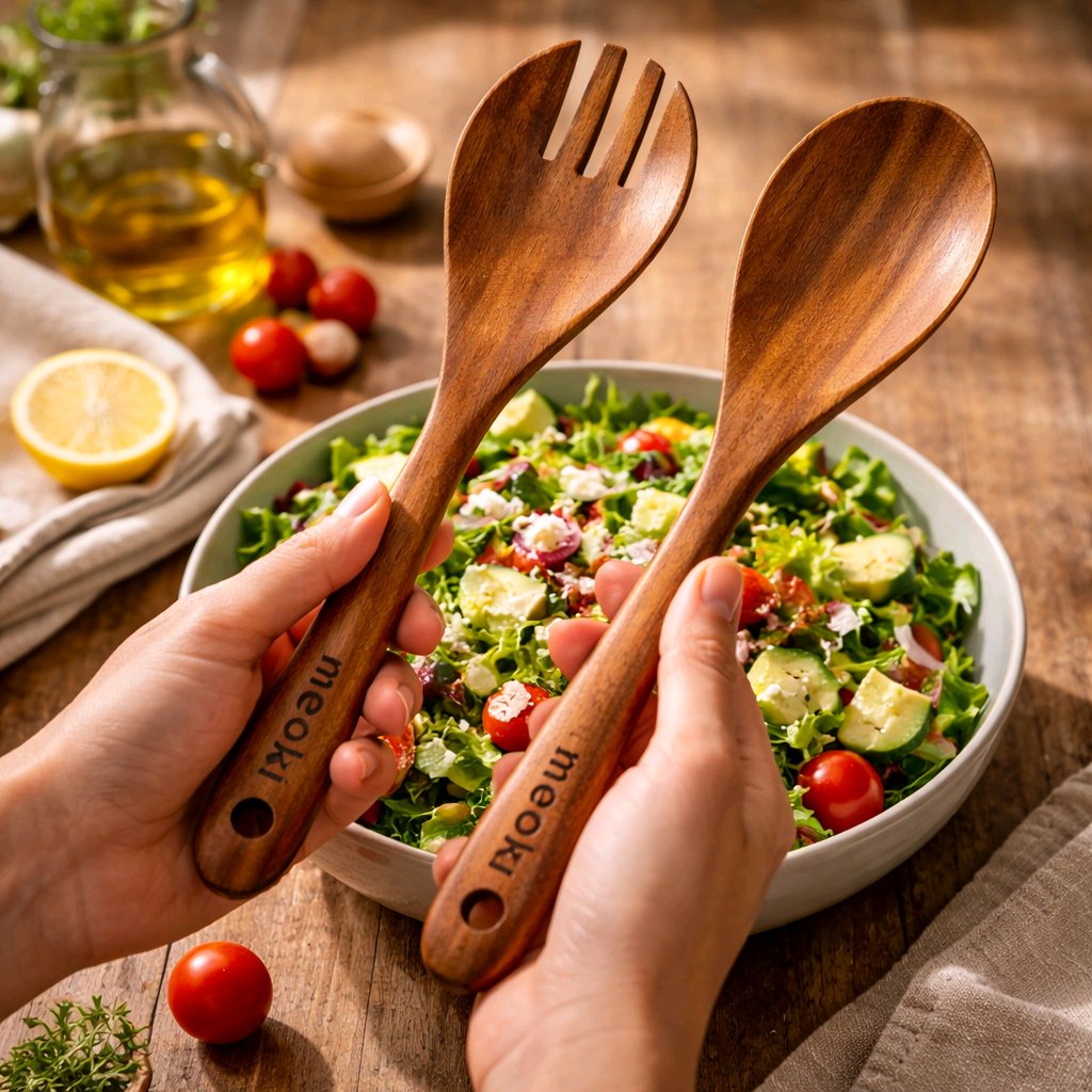 Each piece is hand-carved from solid acacia wood, celebrated for its durability, rich tones, and expressive grain. Smooth to the touch and perfectly balanced, this set elevates the simple act of serving—whether it’s a fresh salad, pasta, roasted vegetables, or shared family dishes.