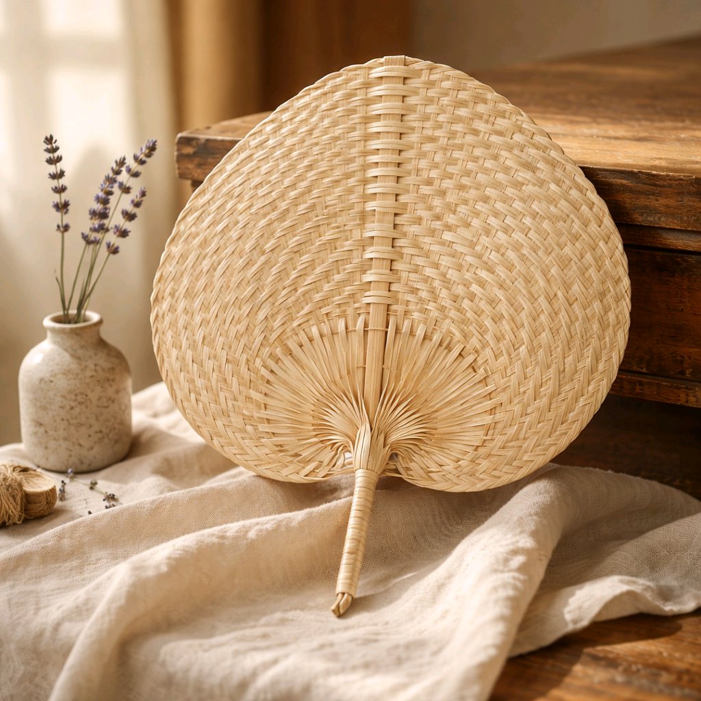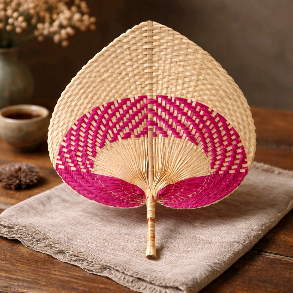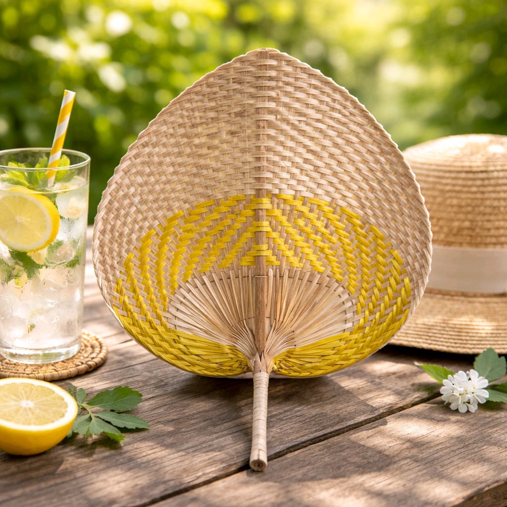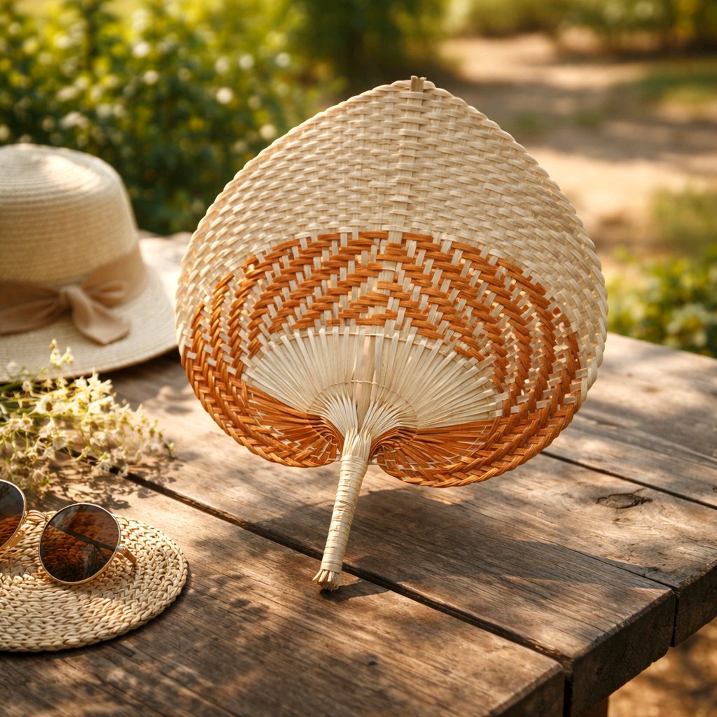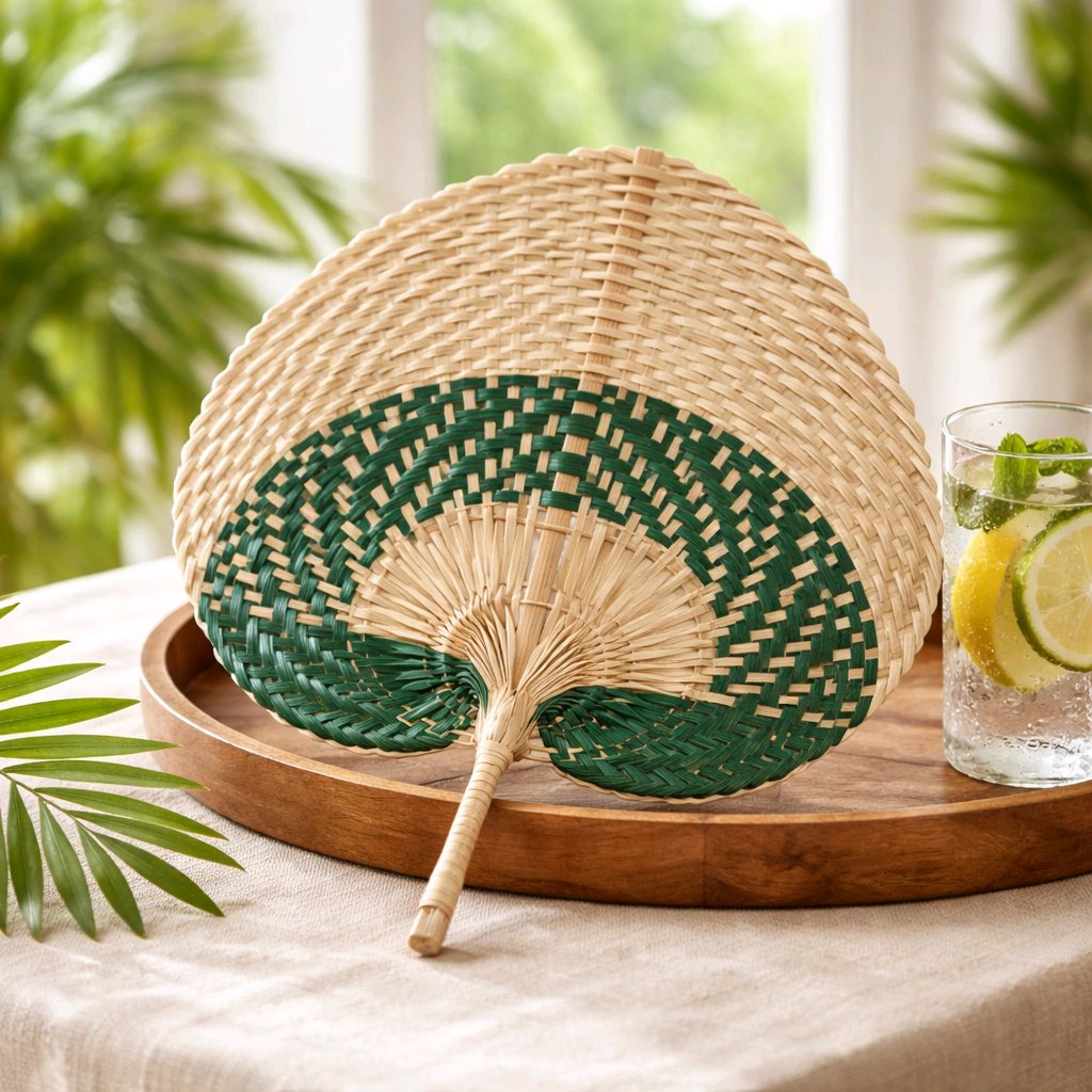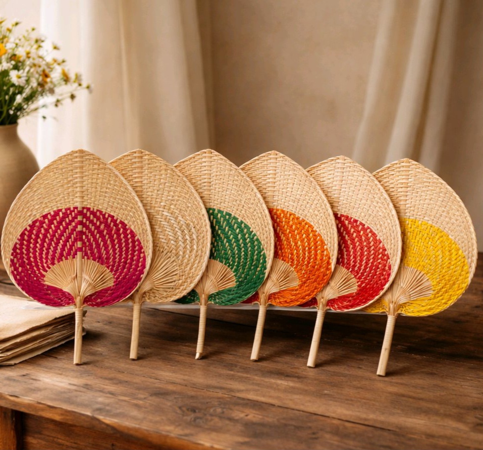 Handcrafted palm hand fan made from natural palm leaves and a bamboo handle. Lightweight, eco-friendly, and available in six woven accent colors — perfect for cooling, décor, travel, or gifting.