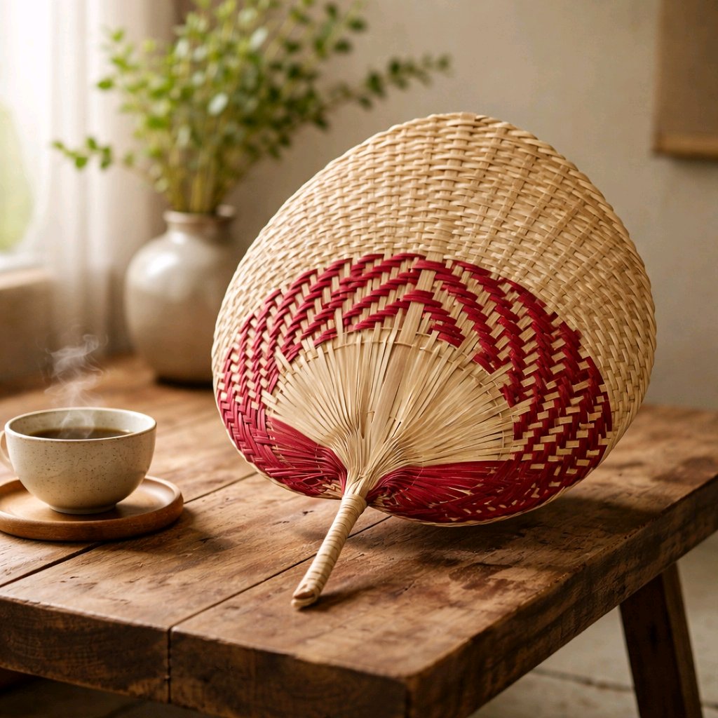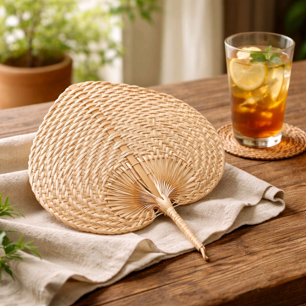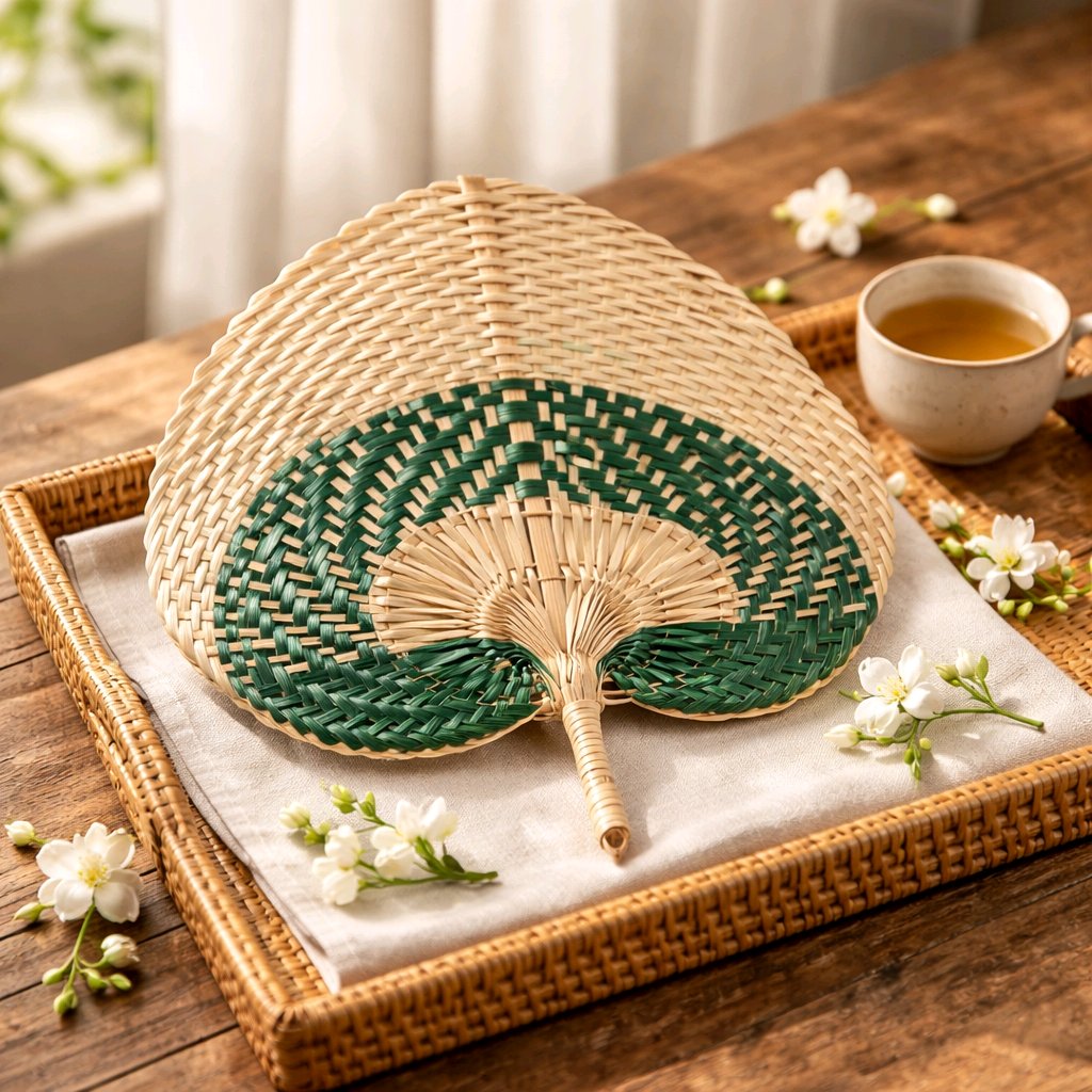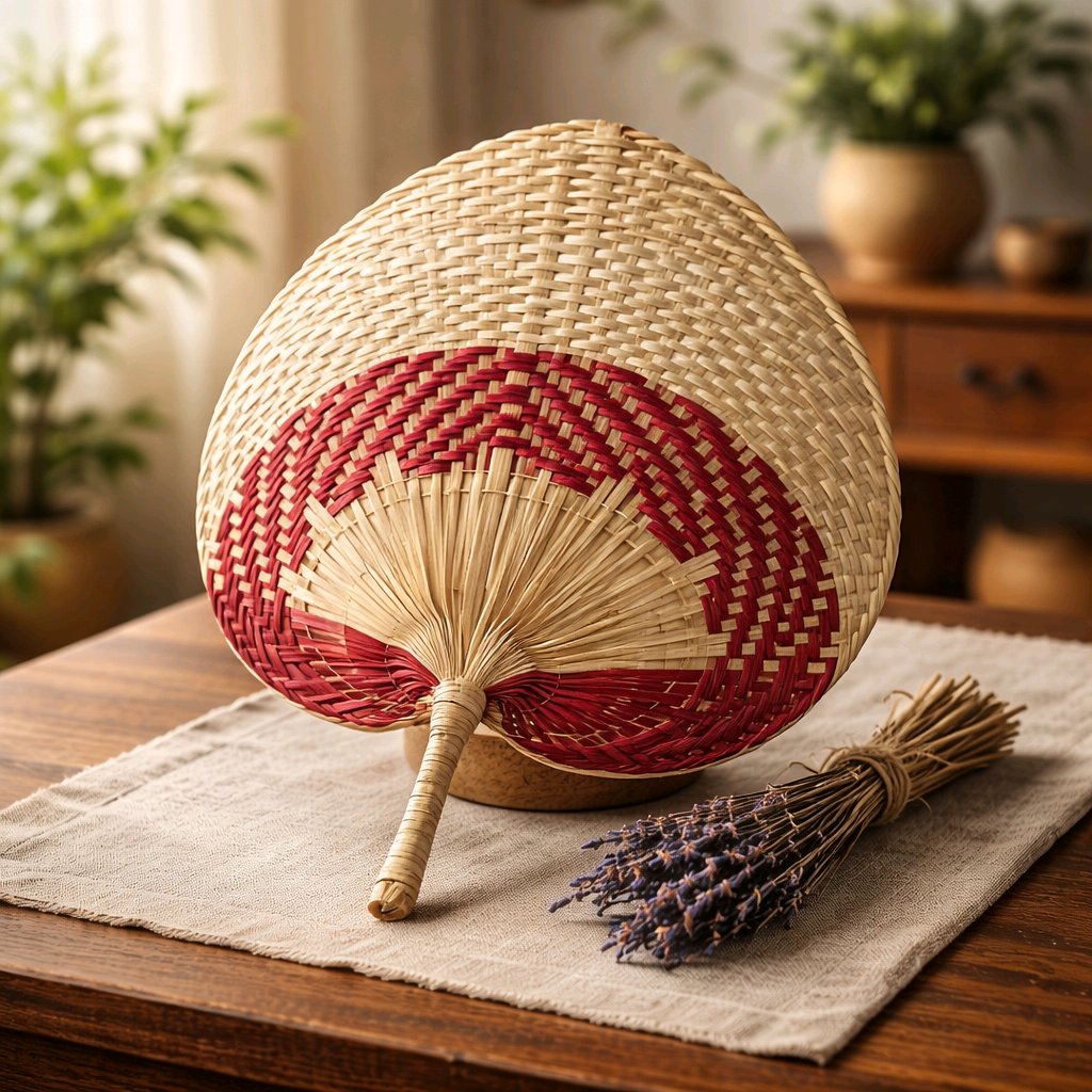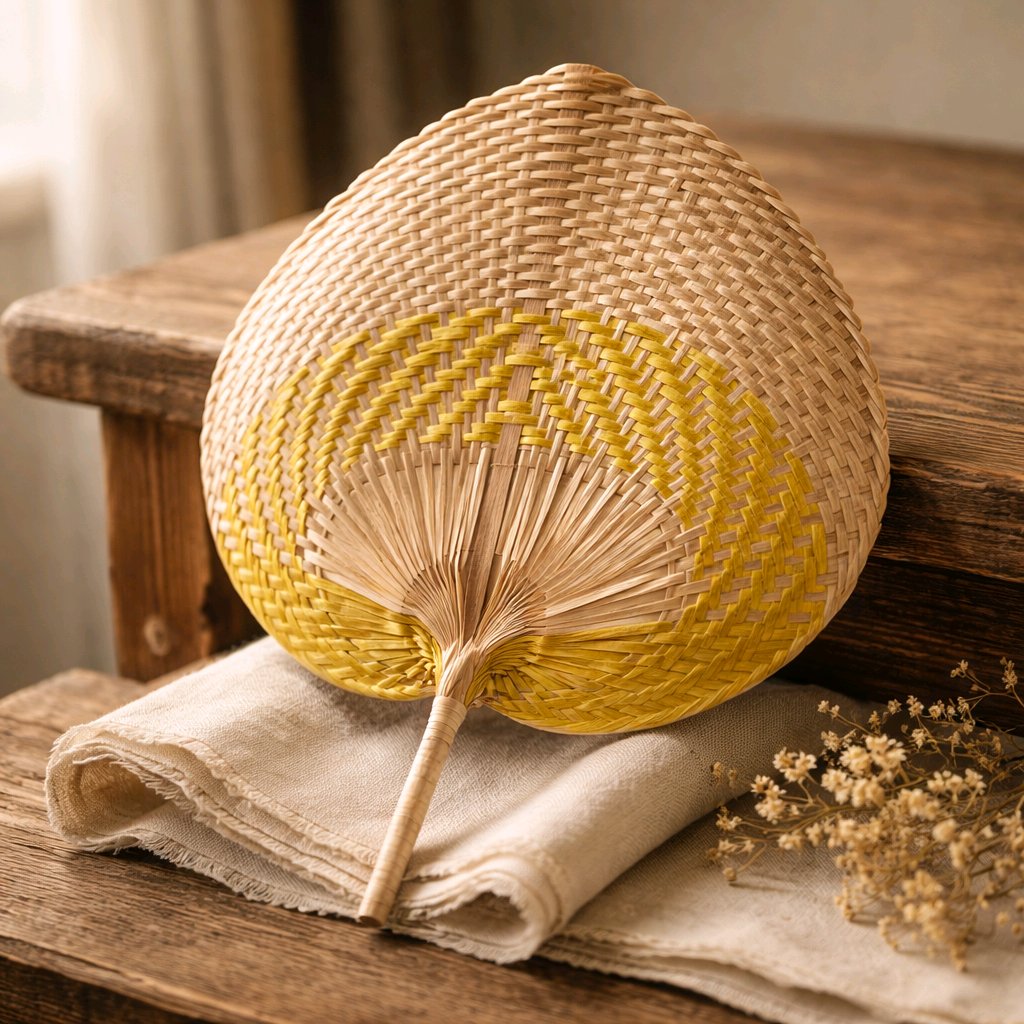 Handcrafted palm hand fan made from natural palm leaves and a bamboo handle. Lightweight, eco-friendly, and available in six woven accent colors — perfect for cooling, décor, travel, or gifting.