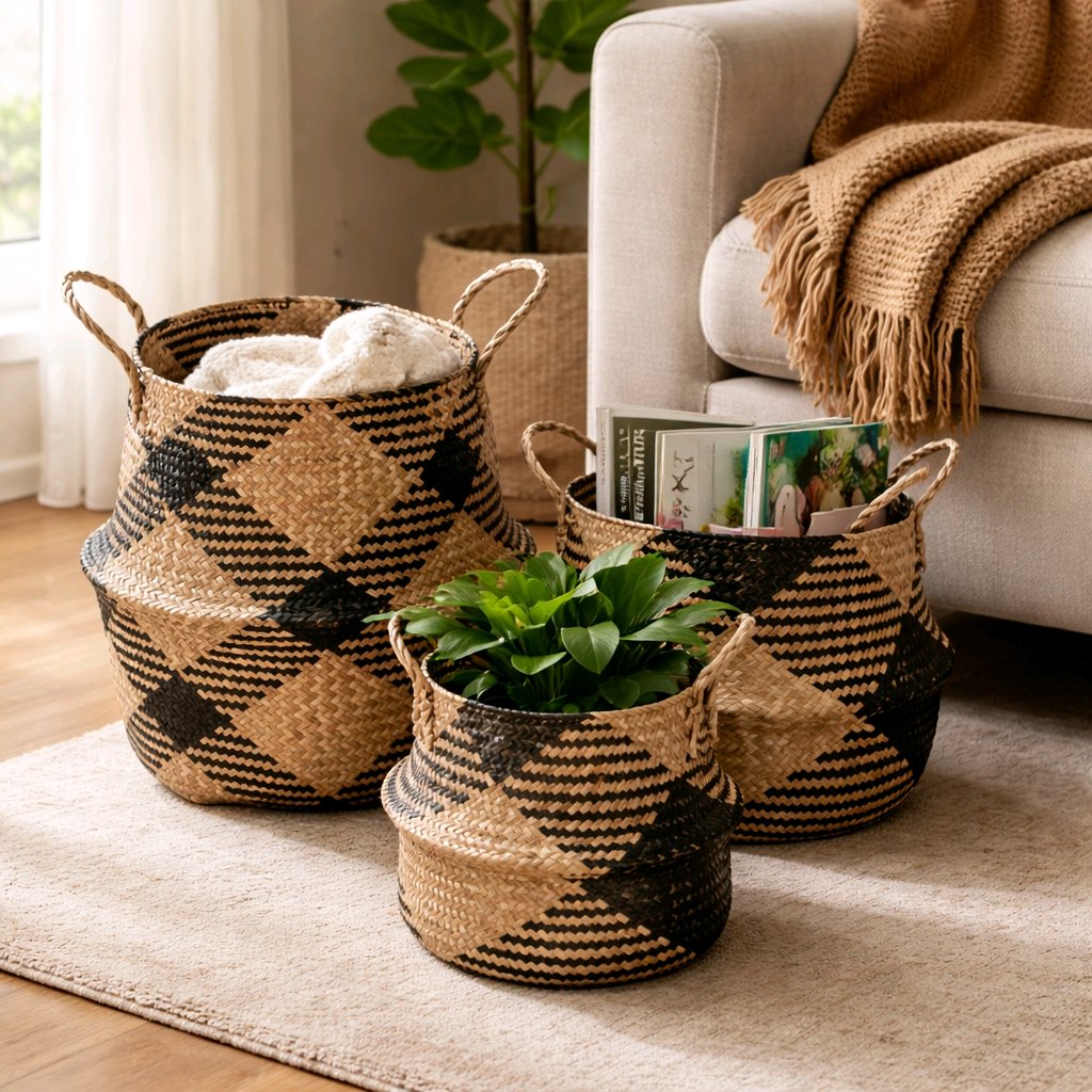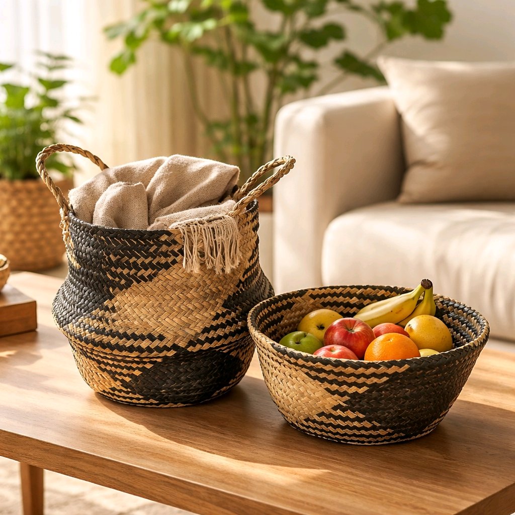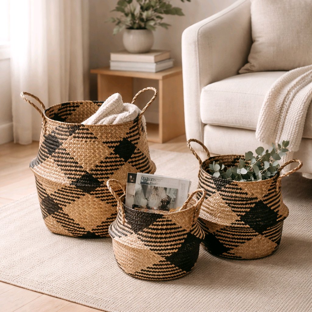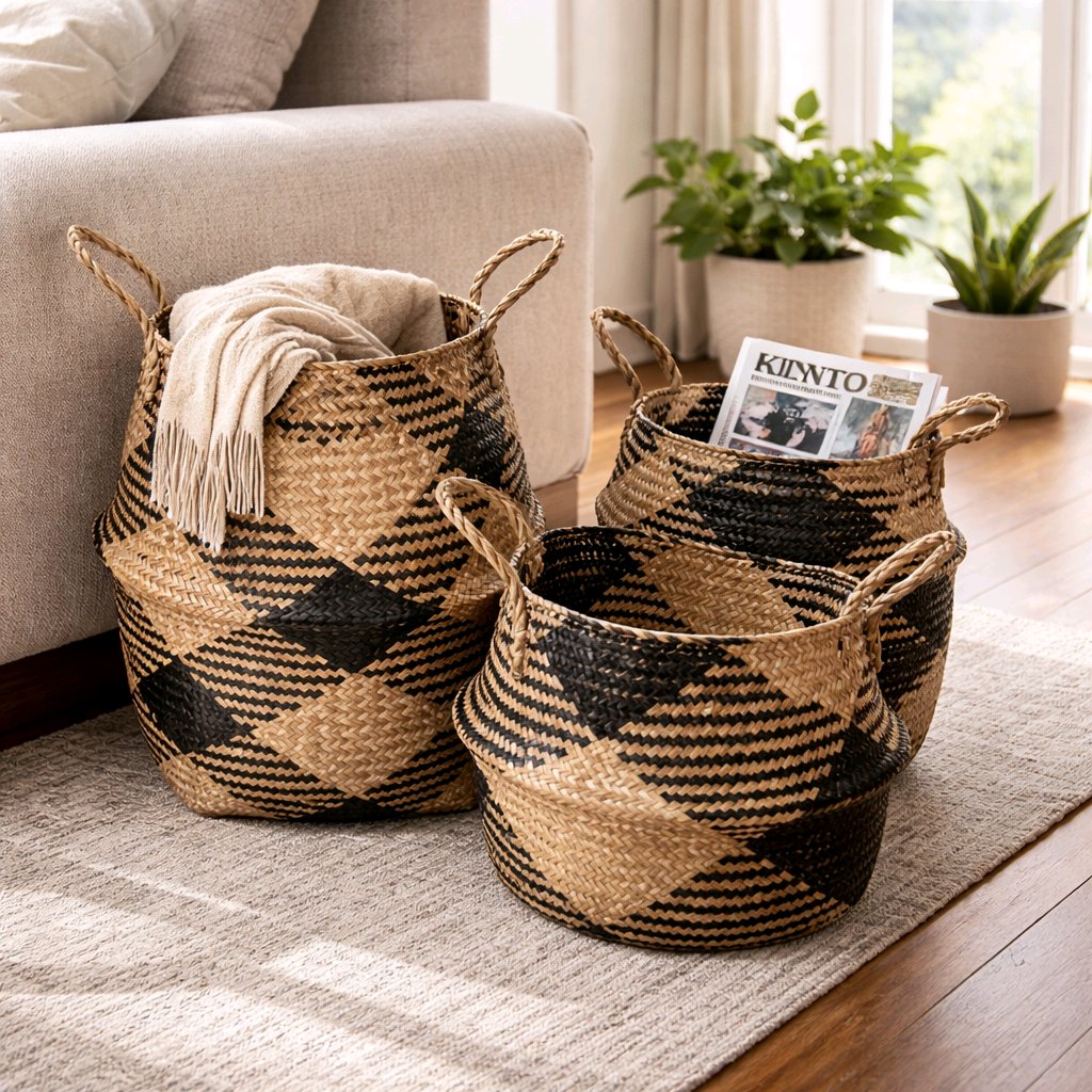 A handwoven buri palm belly basket designed for natural home storage. Foldable, eco-friendly, and handmade—ideal for organizing blankets, laundry, toys, or everyday essentials.