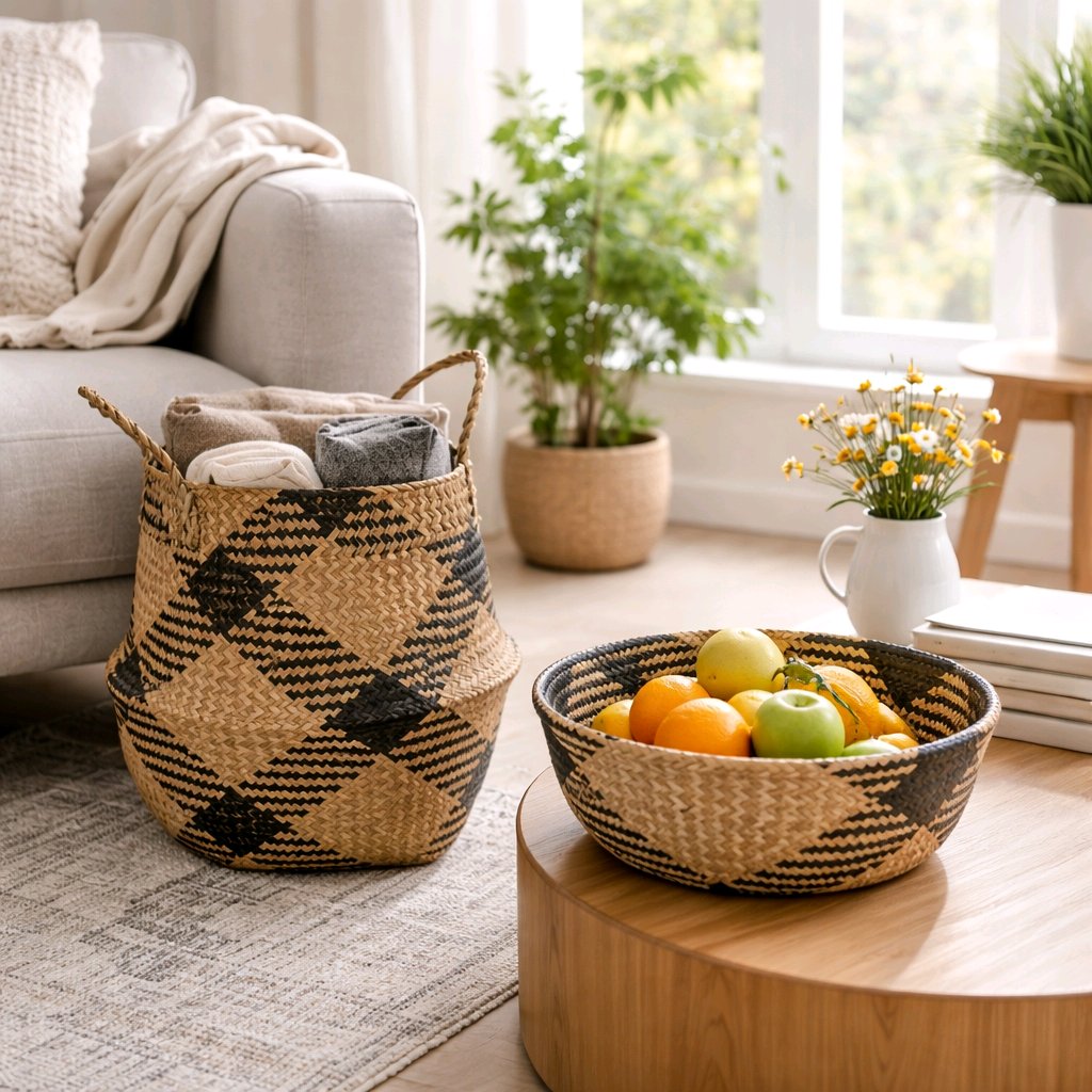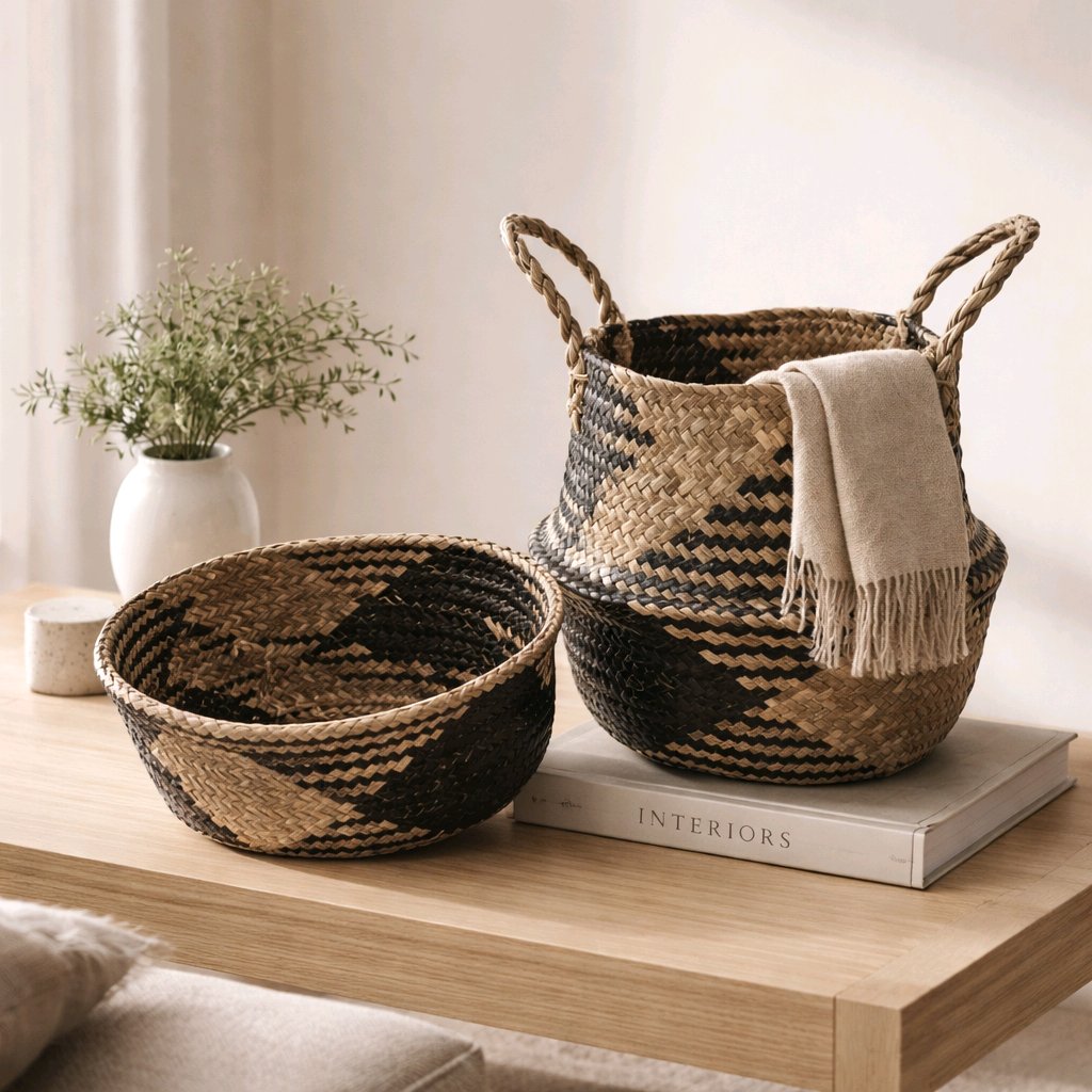 Crafted by skilled artisans using natural buri palm and seaweed, each basket is carefully handmade, giving it a unique character and organic beauty. Its soft yet structured shape makes it both functional and decorative—an effortless way to organize your space while enhancing your interior.