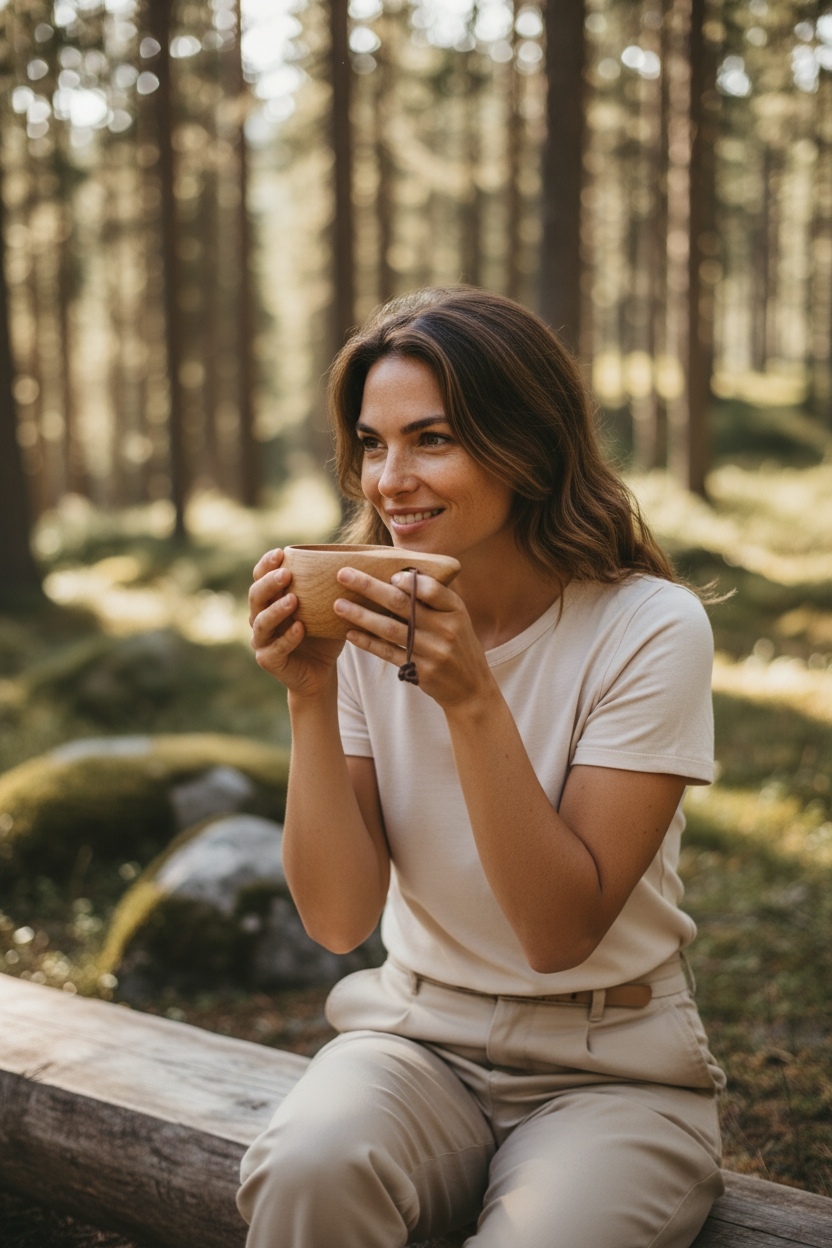 Warm and grounding, highlighting natural wood grain and a strong connection to nature.