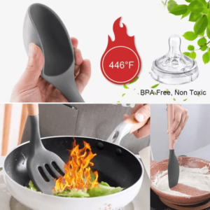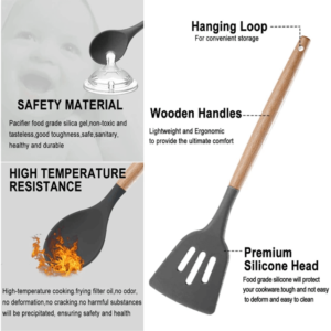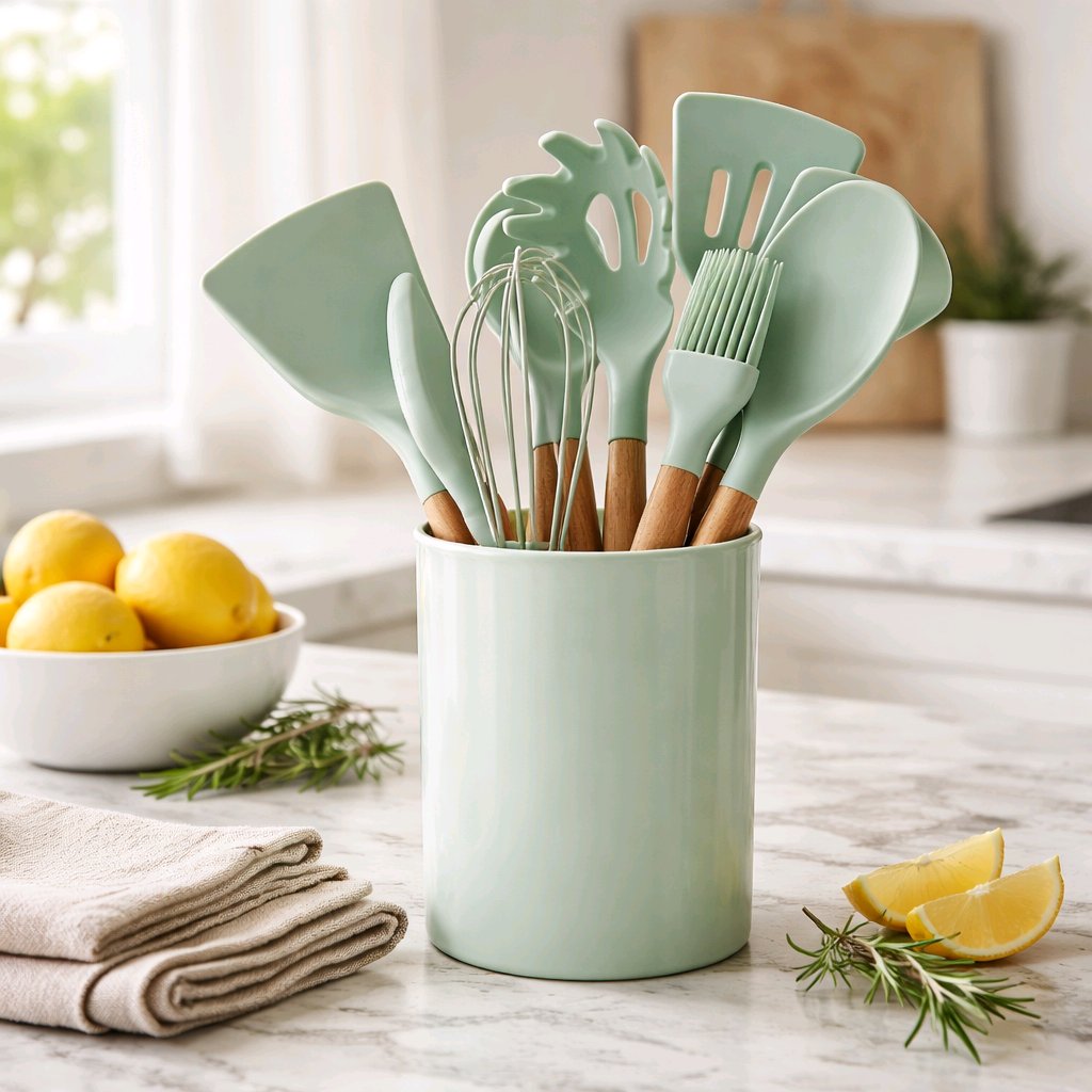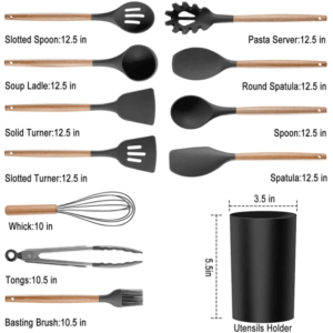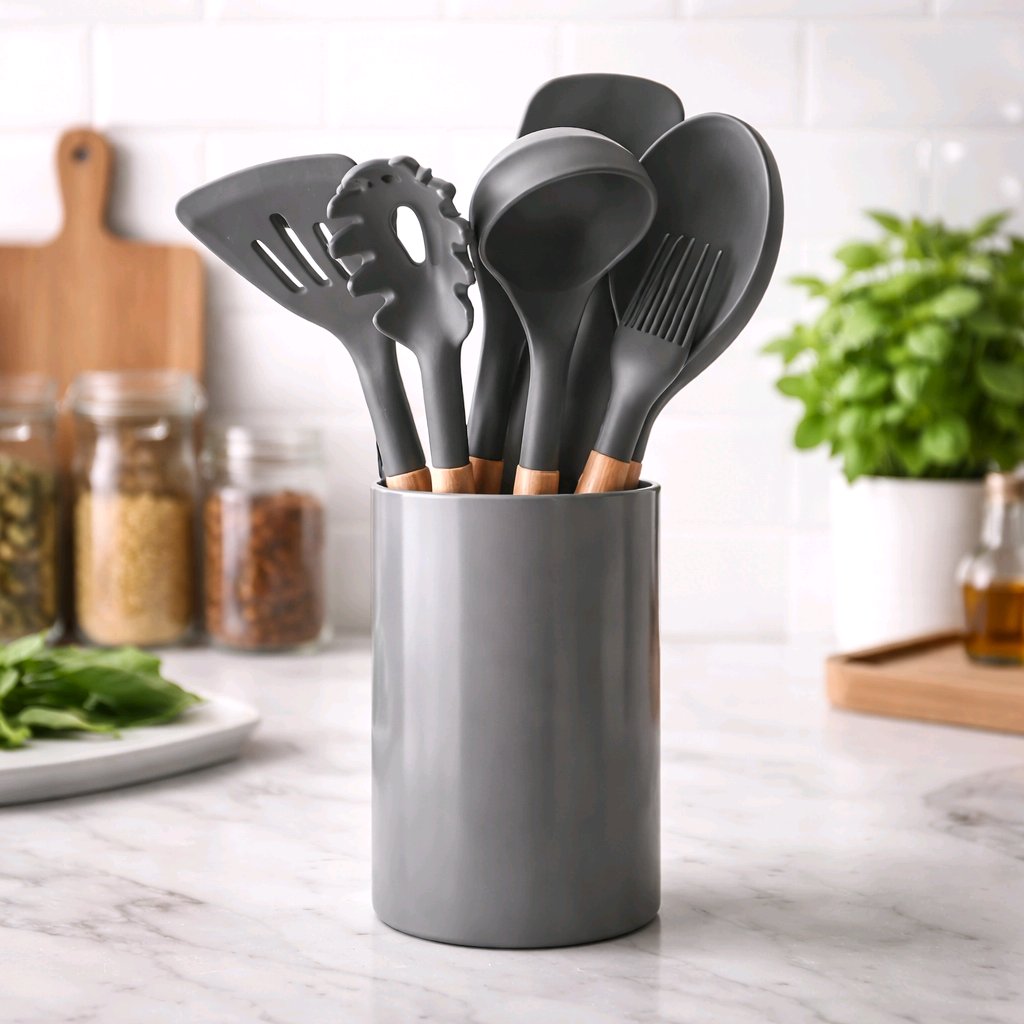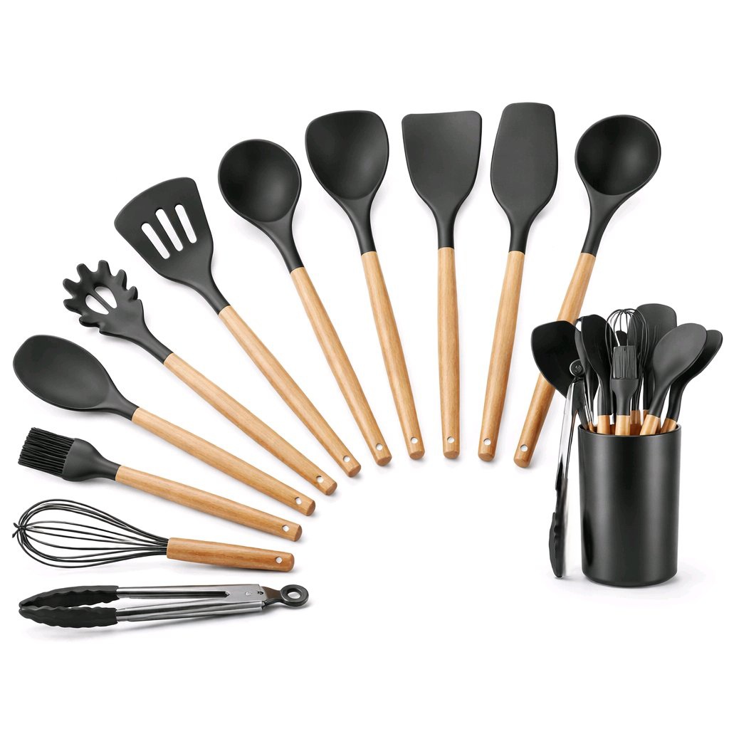 12-piece silicone cooking utensils set with beech wood handles. Food-safe, dishwasher safe, heat-resistant, and perfect for everyday cooking.